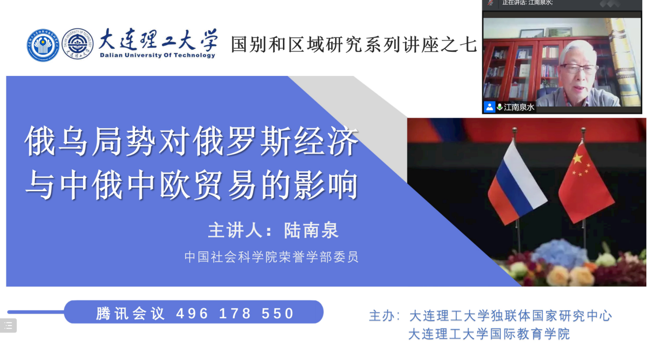2022年4月22日上午,大连理工大学独联体国家研究中心和国际教育学院主办的国别和区域研究系列讲座第七期顺利开讲。中国社会科学院荣誉学部委员,独联体国家研究中心学术委员会名誉主任陆南泉做了题为《俄乌局势对俄罗斯经济与中俄中欧贸易的影响》的报告,中心常务副主任郭淑红教授主持,线上百余名师生参加。